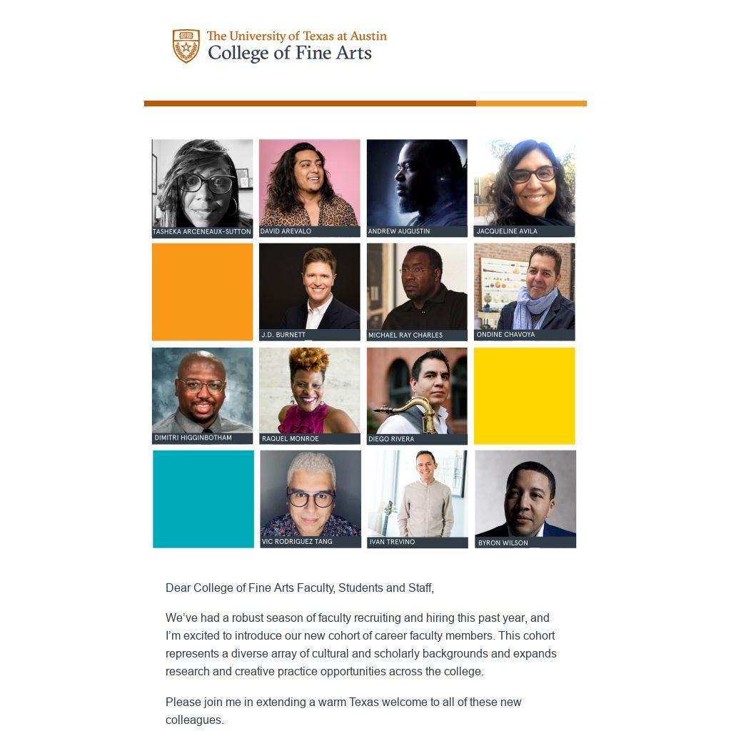 We also have many part-time faculty members joining us this year and supporting our teaching needs in the college in all of our departments. I hope you’ll reach out and introduce yourselves to your new colleagues and make them all feel at home here as they join the COFA family.