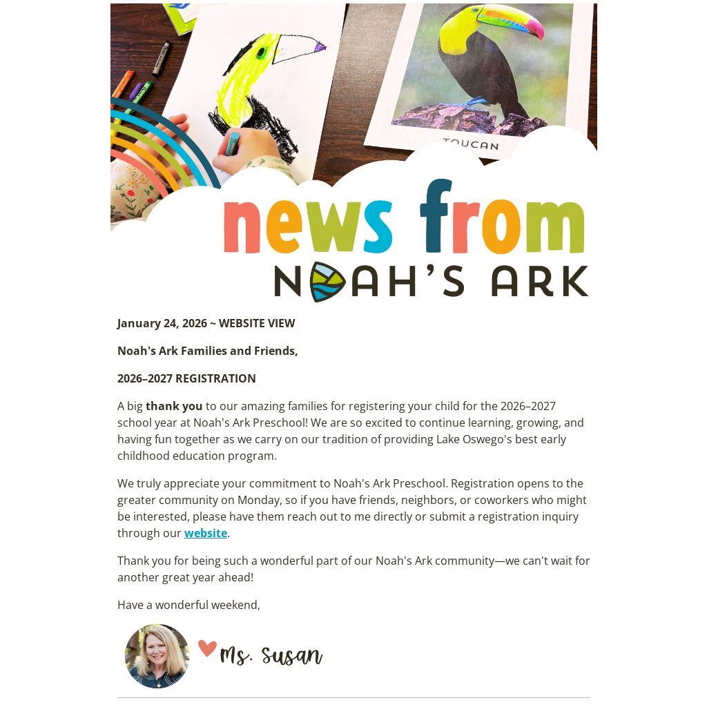 We truly appreciate your commitment to Noah's Ark Preschool. Registration opens to the greater community on Monday, so if you have friends, neighbors, or coworkers who might be interested, please have them reach out to me directly or submit a registration inquiry through our website.