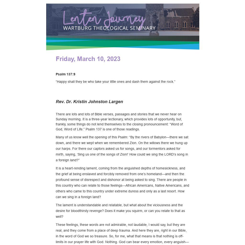 There are lots and lots of Bible verses, passages and stories that we never hear on Sunday morning. It is a three-year lectionary, which provides lots of opportunity, but, frankly, some things do not lend themselves to the closing pronouncement: “Word of God, Word of Life.” Psalm 137 is one of those readings.
