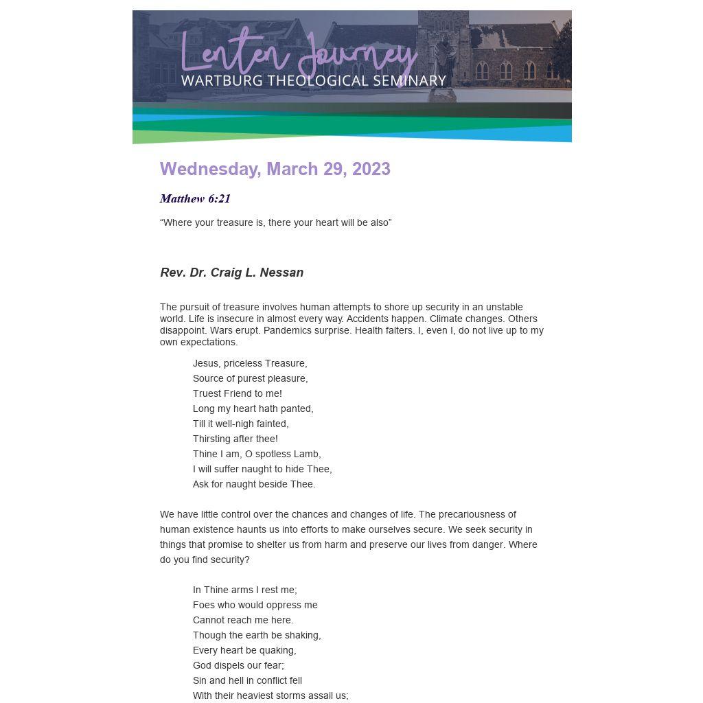 There is One in whom your life is secure. Jesus Christ is treasure unlike all others. The Gospel of God's mercy in Christ Jesus secures you now and forever. Our Lenten journey leads us to the cross and resurrection, treasure that secures you to live each day trusting in God's faithfulness.