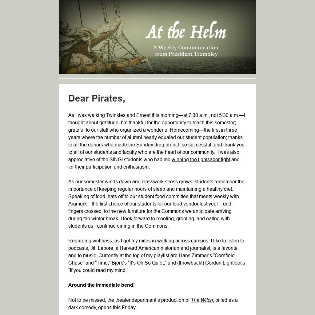 As I was walking Twinkles and Ernest this morning—at 7:30 a.m., not 5:30 a.m.—I thought about gratitude. I’m thankful for the opportunity to teach this semester; grateful to our staff who organized a wonderful Homecoming—the first in three years where the number of alumni nearly equaled our student population; thanks to all the donors who made the Sunday drag brunch so successful, and thank you to all of our students and faculty who are the heart of our community. I was also appreciative of the SING! students who had me winning the lightsaber fight and for their participation and enthusiasm.