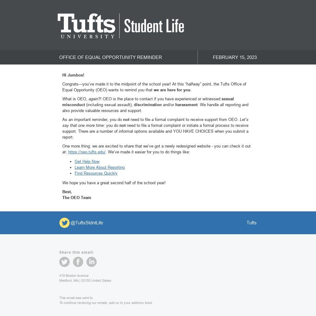 Congrats—you’ve made it to the midpoint of the school year! At this “halfway” point, the Tufts Office of Equal Opportunity (OEO) wants to remind you that we are here for you.