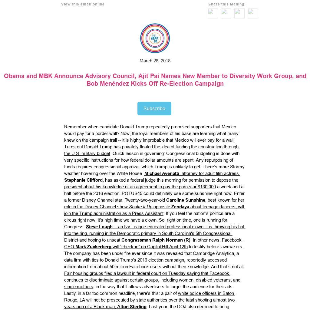 Remember when candidate Donald Trump repeatedly promised supporters that Mexico would pay for a border wall? Now, the loyal members of his base are learning what many knew on the campaign trail -- it is highly improbable that Mexico will ever pay for a wall. Turns out Donald Trump has privately floated the idea of funding the construction through the U.S. military budget. Quick lesson in governing: Congressional budgeting is done with very specific instructions for how federal dollar amounts are spent. Any repurposing of funds requires congressional approval, which Trump is unlikely to get. There’s more Stormy weather hovering over the White House. Michael Avenatti, attorney for adult film actress Stephanie Clifford, has asked a federal judge this morning for permission to depose the president about his knowledge of an agreement to pay the porn star $130,000 a week and a half before the 2016 election. POTUS45 could definitely use some sunshine right now. Enter a former Disney Channel star. Twenty-two-year-old Caroline Sunshine, best known for her role in the Disney Channel show Shake It Up opposite Zendaya about teenage dancers, will join the Trump administration as a Press Assistant. If you feel the nation’s politics are a circus right now, it’s high time we have a clown. So, right on time, one is running for Congress. Steve Lough -- an Ivy League-educated professional clown -- is throwing his hat into the ring, running in the Democratic primary in South Carolina's 5th Congressional District and hoping to unseat Congressman Ralph Norman (R). In other news, Facebook CEO Mark Zuckerberg will “check-in” on Capitol Hill April 12th to testify before lawmakers. The company has been under fire ever since it was revealed that Cambridge Analytica, a data firm with ties to Donald Trump's 2016 election campaign, reportedly accessed information from about 50 million Facebook users without their knowledge. And that’s not all. Fair housing groups filed a lawsuit in federal court on Tuesday saying that Facebook continues to discriminate against certain groups, including women, disabled veterans, and single mothers, in the way that it allows advertisers to target the audience for their ads. Lastly, in a far too common headline, there’s this: a pair of white police officers in Baton Rouge, LA will not be prosecuted by state authorities over the fatal shooting almost two years ago of a Black man, Alton Sterling. Last year, the DOJ also declined to bring charges in the case. Time to push through. We’re kicking off Wednesday with this...