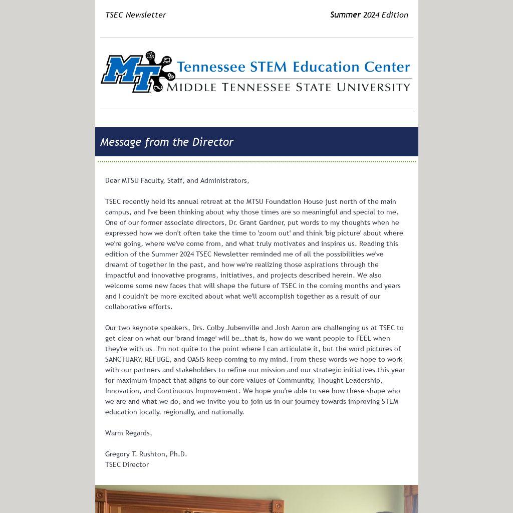 TSEC recently held its annual retreat at the MTSU Foundation House just north of the main campus, and I've been thinking about why those times are so meaningful and special to me. One of our former associate directors, Dr. Grant Gardner, put words to my thoughts when he expressed how we don't often take the time to 'zoom out' and think 'big picture' about where we're going, where we've come from, and what truly motivates and inspires us. Reading this edition of the Summer 2024 TSEC Newsletter reminded me of all the possibilities we've dreamt of together in the past, and how we're realizing those aspirations through the impactful and innovative programs, initiatives, and projects described herein. We also welcome some new faces that will shape the future of TSEC in the coming months and years and I couldn't be more excited about what we'll accomplish together as a result of our collaborative efforts.