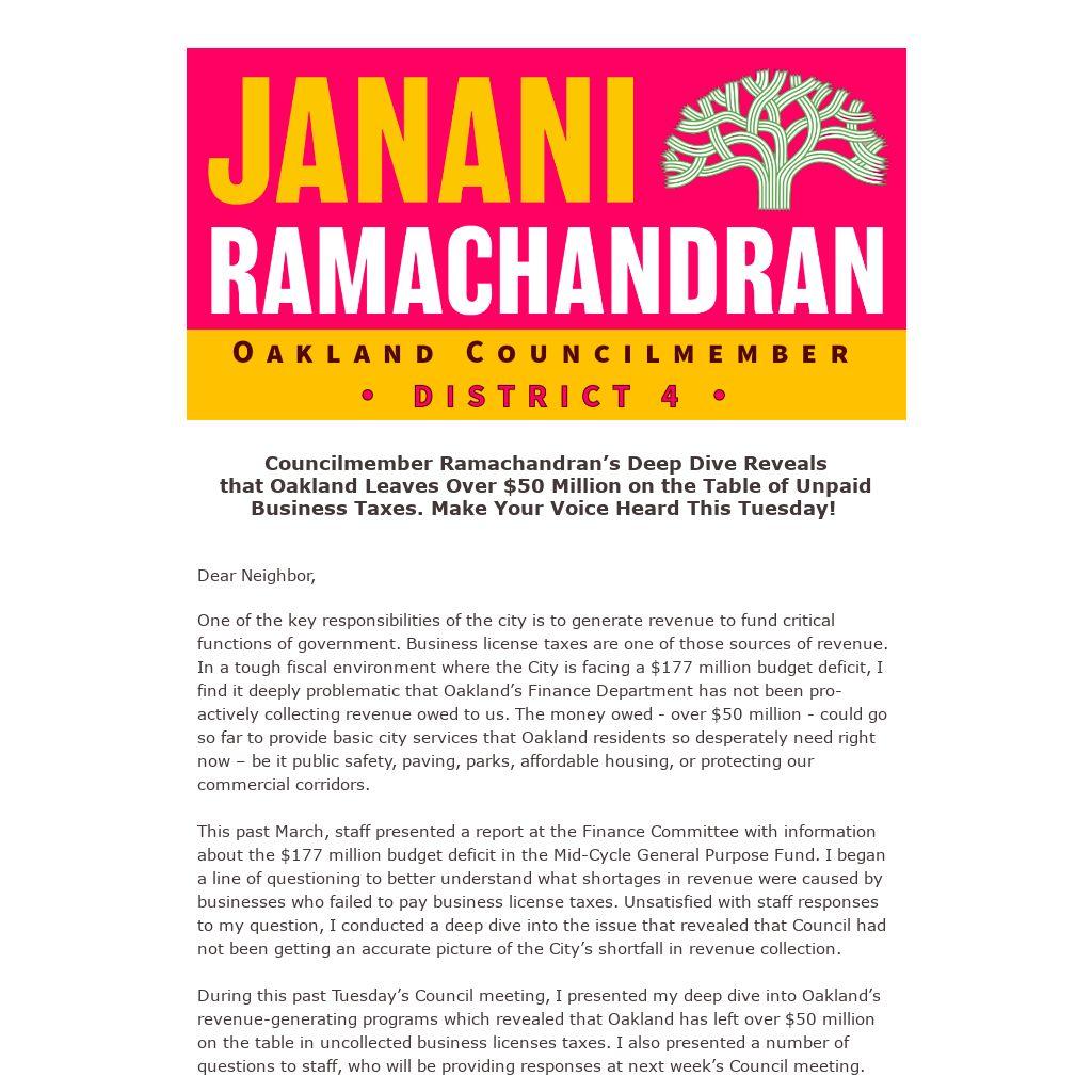 Councilmember Ramachandran’s Deep Dive Reveals that Oakland Leaves Over $50 Million on the Table of Unpaid Business Taxes. Make Your Voice Heard This Tuesday! |