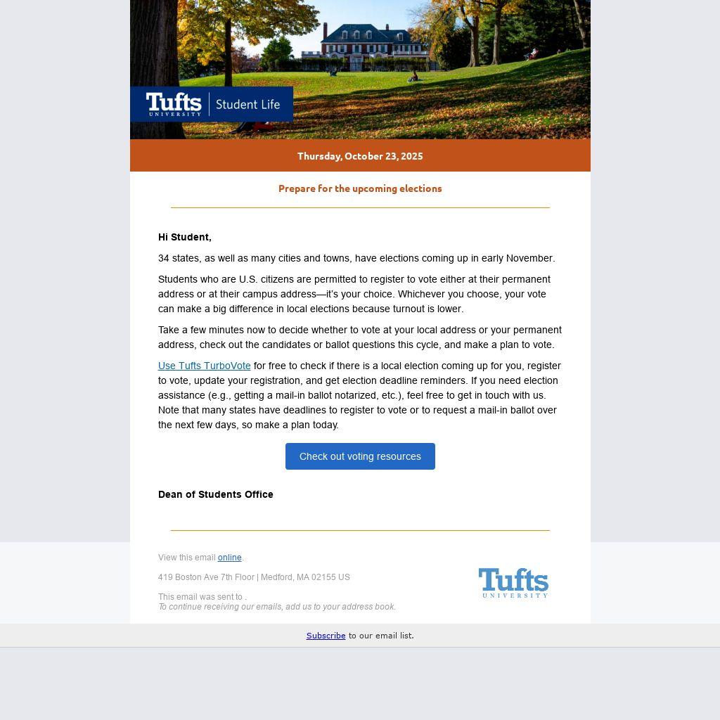 Use Tufts TurboVote for free to check if there is a local election coming up for you, register to vote, update your registration, and get election deadline reminders. If you need election assistance (e.g., getting a mail-in ballot notarized, etc.), feel free to get in touch with us. Note that many states have deadlines to register to vote or to request a mail-in ballot over the next few days, so make a plan today.