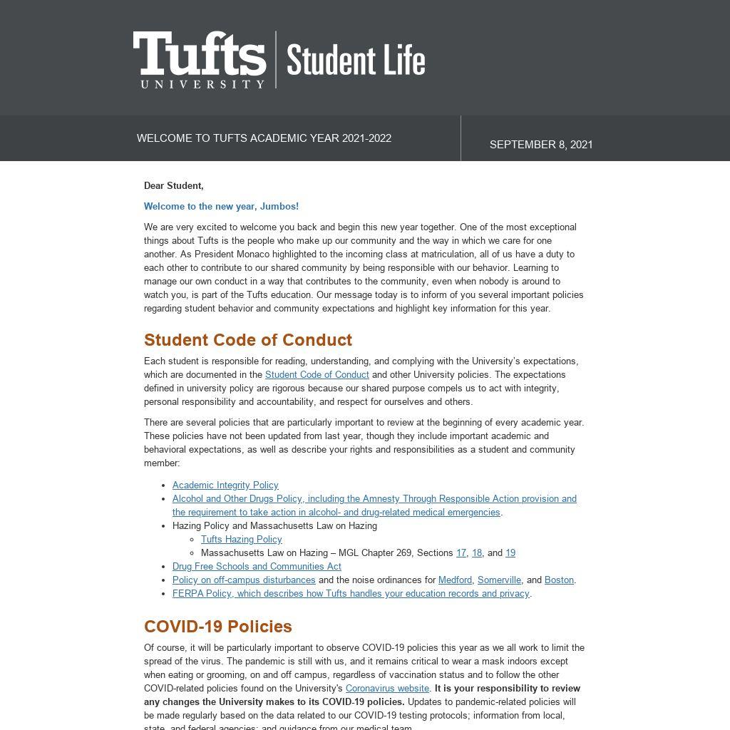 We are very excited to welcome you back and begin this new year together. One of the most exceptional things about Tufts is the people who make up our community and the way in which we care for one another. As President Monaco highlighted to the incoming class at matriculation, all of us have a duty to each other to contribute to our shared community by being responsible with our behavior. Learning to manage our own conduct in a way that contributes to the community, even when nobody is around to watch you, is part of the Tufts education. Our message today is to inform of you several important policies regarding student behavior and community expectations and highlight key information for this year.