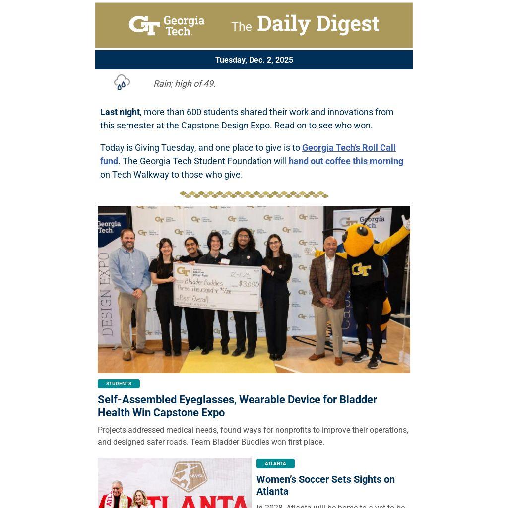Today is Giving Tuesday, and one place to give is to Georgia Tech’s Roll Call fund. The Georgia Tech Student Foundation will hand out coffee this morning on Tech Walkway to those who give.