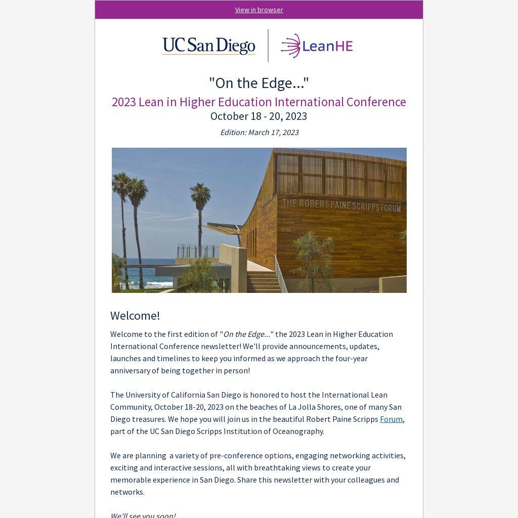 Welcome to the first edition of "On the Edge..." the 2023 Lean in Higher Education International Conference newsletter! We'll provide announcements, updates, launches and timelines to keep you informed as we approach the four-year anniversary of being together in person!