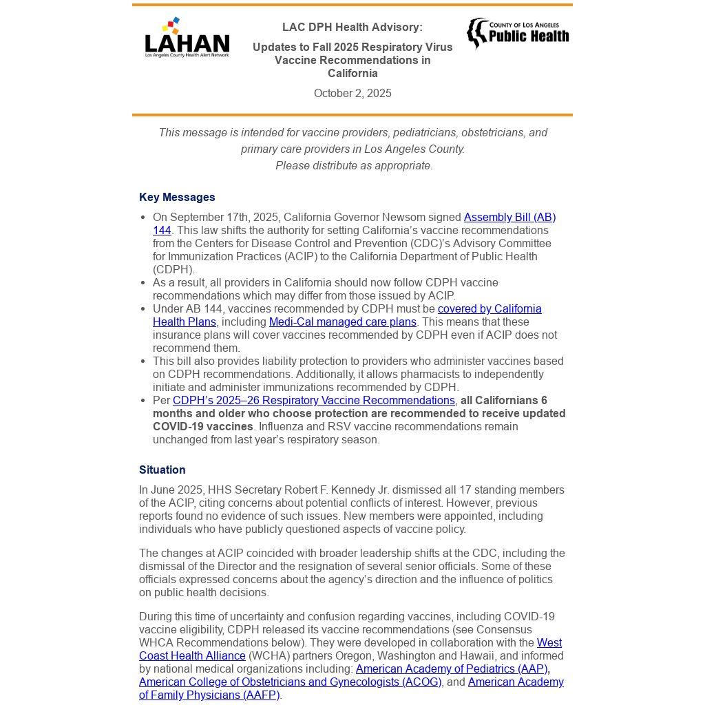This communication was sent by Dr. Nava Yeganeh, Medical Director, Vaccine Preventable Disease Control Program, Los Angeles County Department of Public Health.