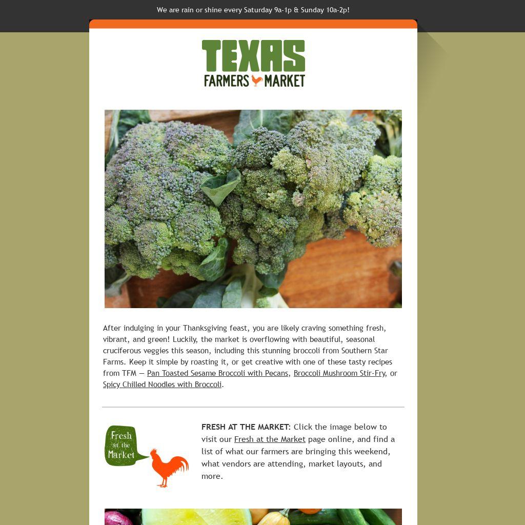 Arugula * Basil (holy, sweet) * Beans (Asian, purple long, green) * Bok choy * Beets * Broccoli * Cabbage (napa, green) * Carrots * Chard * Cilantro * Collard greens * Cucumbers * Dill * Eggplant * Garlic chives * Green onions * Herbs * Kale (red Russian, curly, lacinato) * Lettuce * Moringa * Mustard greens * Okra * Onions (yellow, red, white) * Parsley * Pears * Pecans * Peppers (sweet, shishito, hot, bell, jalapeno, lunchbox) * Persimmons * Potatoes * Pumpkins * Radishes (daikon, red, watermelon) * Spinach * Squash (zucchini, yellow, spaghetti, butternut, acorn) * Sweet potatoes * Tomatoes * Turnips