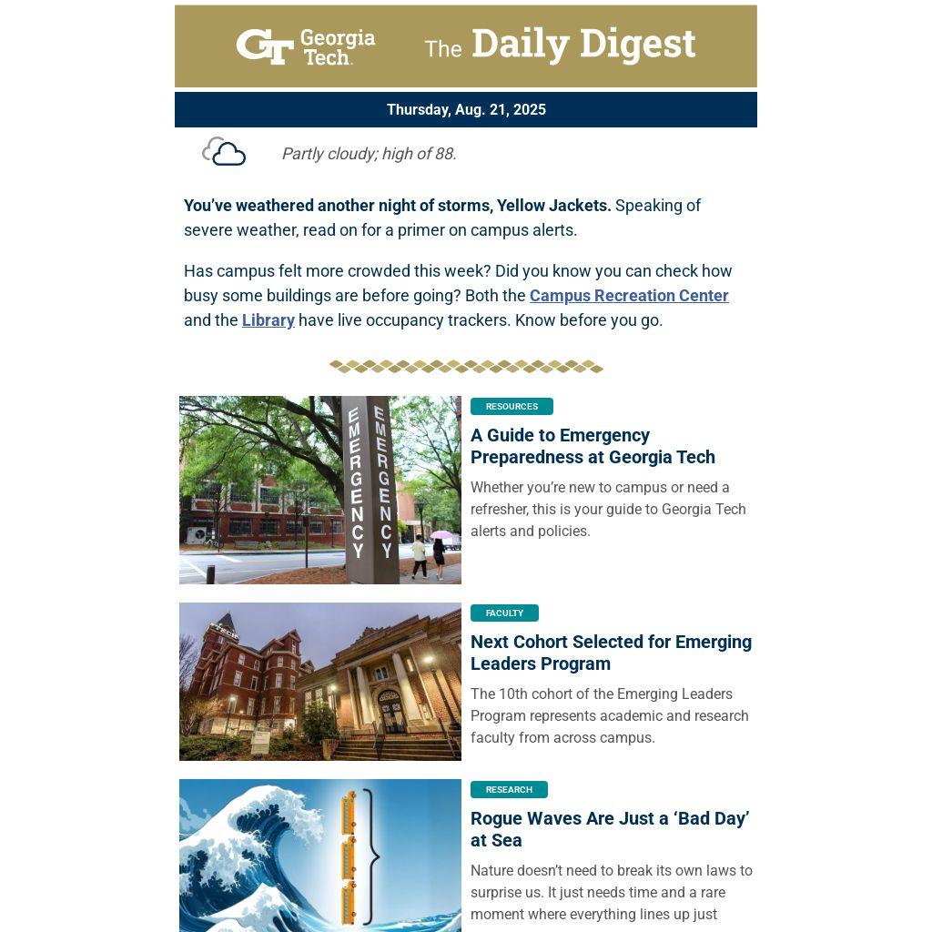 You’ve weathered another night of storms, Yellow Jackets. Speaking of severe weather, read on for a primer on campus alerts.