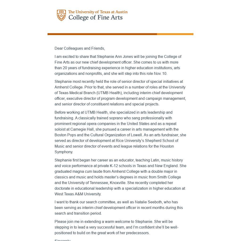 I am excited to share that Stephanie Ann Jones will be joining the College of Fine Arts as our new chief development officer. She comes to us with more than 20 years of fundraising experience in higher education institutions, arts organizations and nonprofits, and she will step into this role Nov. 10.