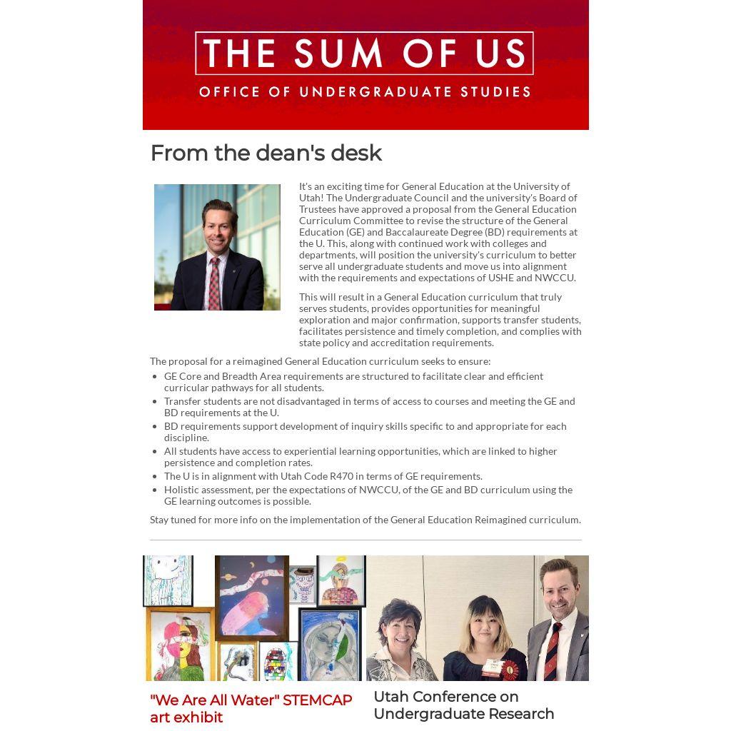 It's an exciting time for General Education at the University of Utah! The Undergraduate Council and the university's Board of Trustees have approved a proposal from the General Education Curriculum Committee to revise the structure of the General Education (GE) and Baccalaureate Degree (BD) requirements at the U. This, along with continued work with colleges and departments, will position the university's curriculum to better serve all undergraduate students and move us into alignment with the requirements and expectations of USHE and NWCCU.