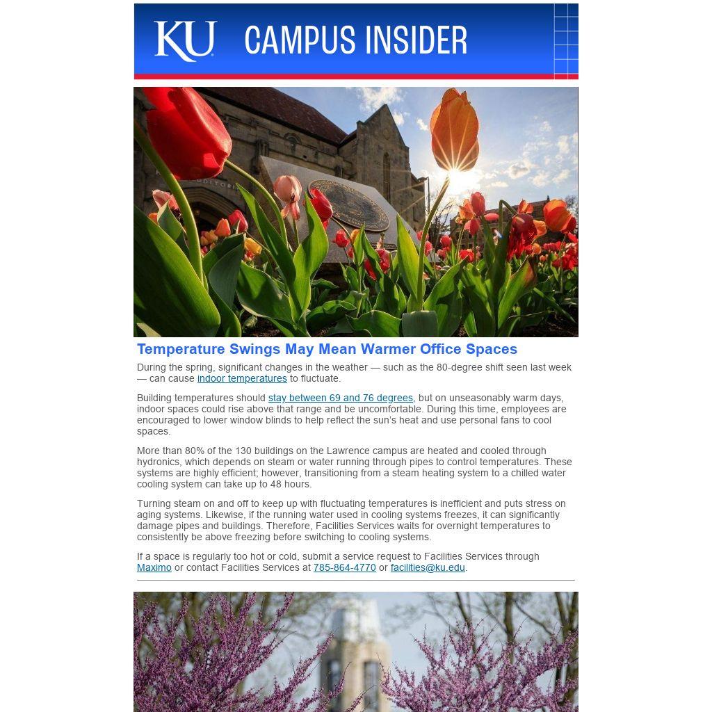 If a space is regularly too hot or cold, submit a service request to Facilities Services through Maximo or contact Facilities Services at 785-864-4770 or facilities@ku.edu.