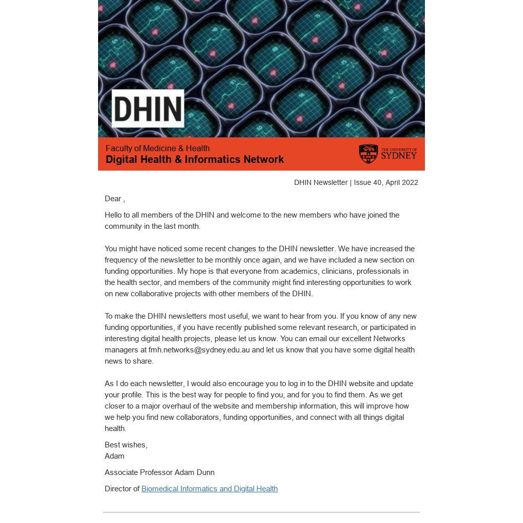 To make the DHIN newsletters most useful, we want to hear from you. If you know of any new funding opportunities, if you have recently published some relevant research, or participated in interesting digital health projects, please let us know. You can email our excellent Networks managers at fmh.networks@sydney.edu.au and let us know that you have some digital health news to share.