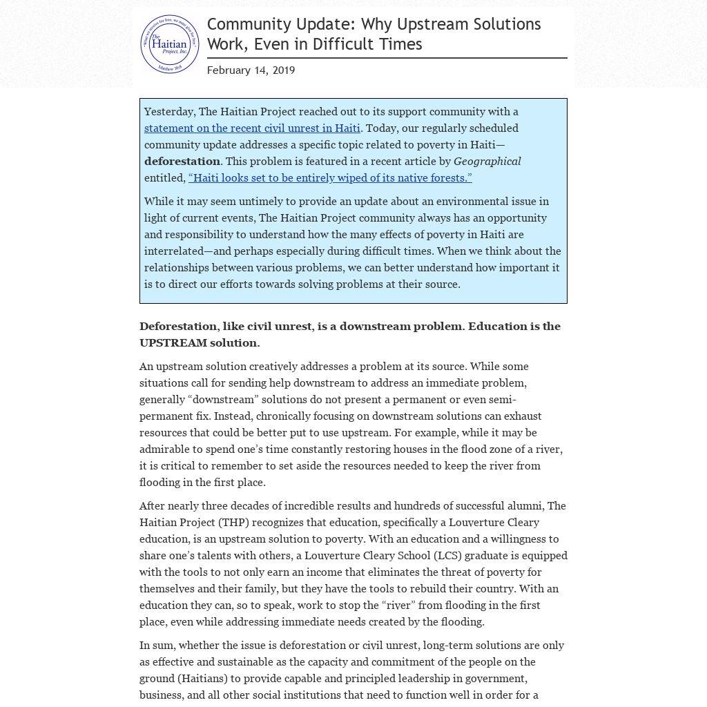 After nearly three decades of incredible results and hundreds of successful alumni, The Haitian Project (THP) recognizes that education, specifically a Louverture Cleary education, is an upstream solution to poverty. With an education and a willingness to share one’s talents with others, a Louverture Cleary School (LCS) graduate is equipped with the tools to not only earn an income that eliminates the threat of poverty for themselves and their family, but they have the tools to rebuild their country. With an education they can, so to speak, work to stop the “river” from flooding in the first place, even while addressing immediate needs created by the flooding.