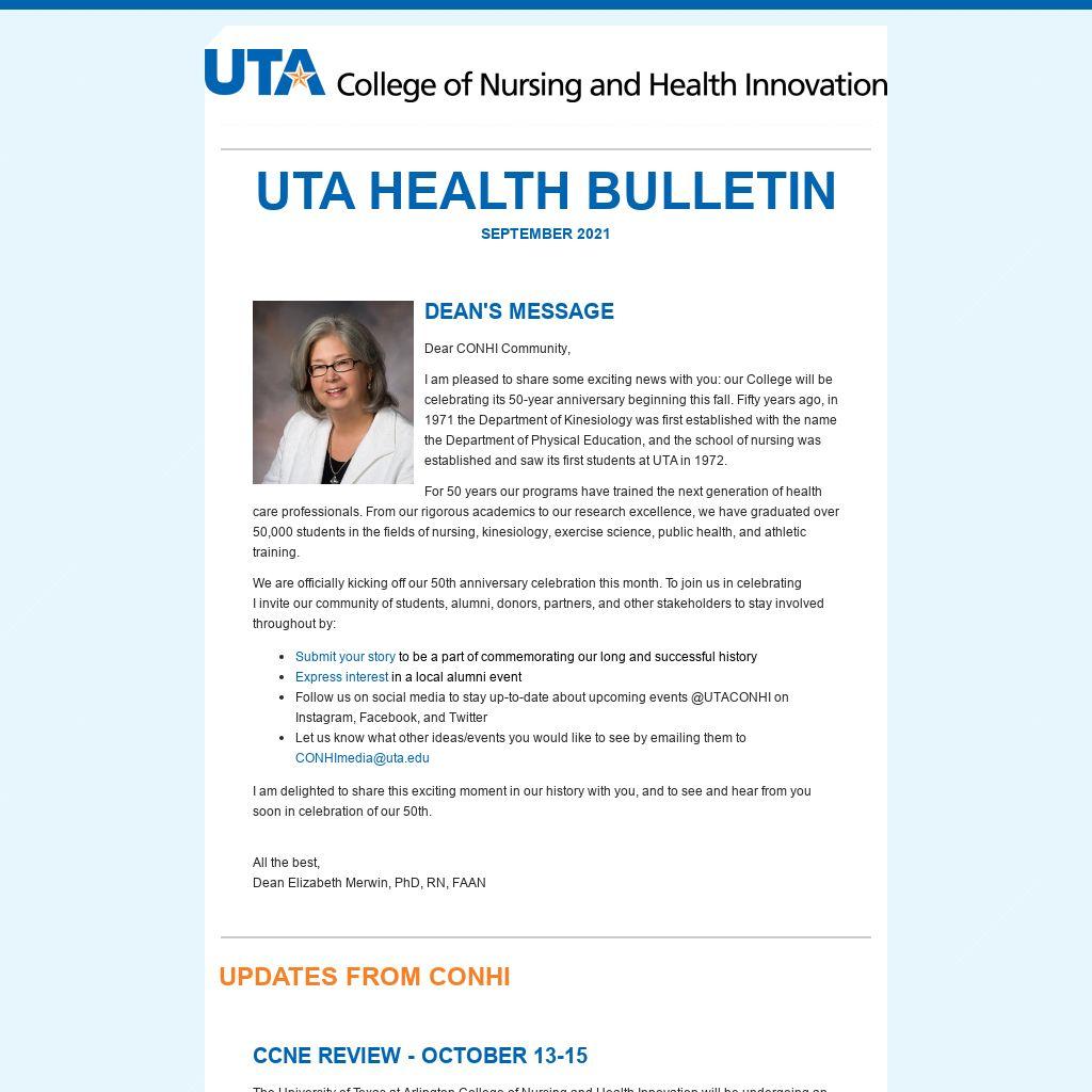 I am pleased to share some exciting news with you: our College will be celebrating its 50-year anniversary beginning this fall. Fifty years ago, in 1971 the Department of Kinesiology was first established with the name the Department of Physical Education, and the school of nursing was established and saw its first students at UTA in 1972.
