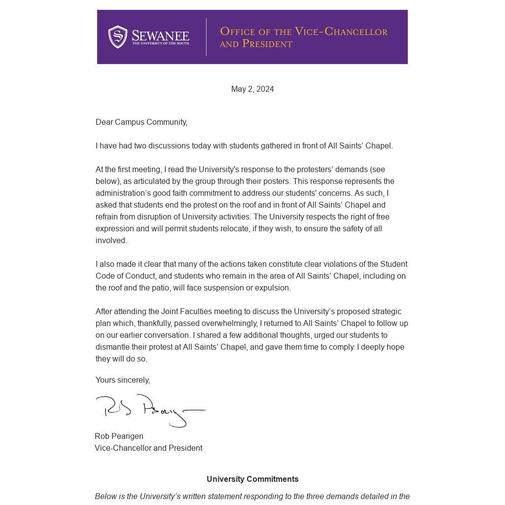 Below is the University’s written statement responding to the three demands detailed in the posters attributed to #sewaneeforpalestine and @sewaneeforpalestine. These commitments are the groundwork for the conversation held today. I am confident that we can reach a good faith resolution today.