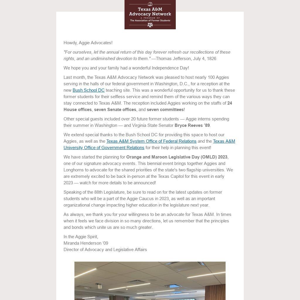 Last month, the Texas A&M Advocacy Network was pleased to host nearly 100 Aggies serving in the halls of our federal government in Washington, D.C., for a reception at the new Bush School DC teaching site. This was a wonderful opportunity for us to thank these former students for their selfless service and remind them of the various ways they can stay connected to Texas A&M. The reception included Aggies working on the staffs of 24 House offices, seven Senate offices, and seven committees!