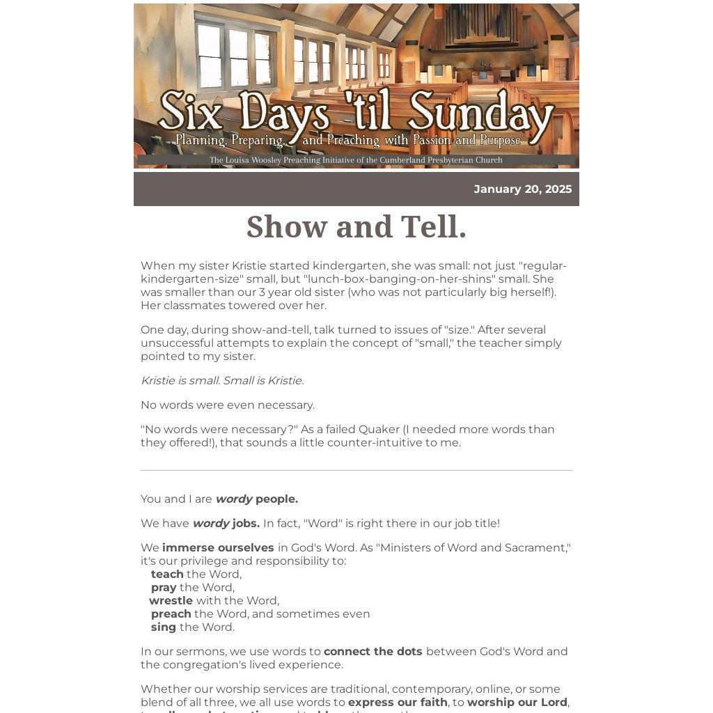 If you missed a week, or would like to go back and re-read something, you can find links to all the past issues of "Six Days 'til Sunday" at the bottom of our webpage.