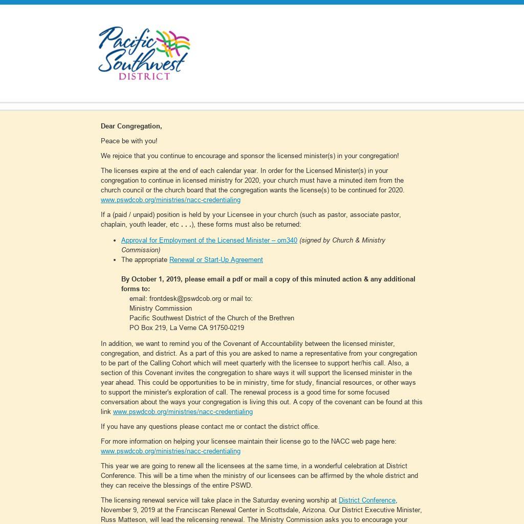 In addition, we want to remind you of the Covenant of Accountability between the licensed minister, congregation, and district. As a part of this you are asked to name a representative from your congregation to be part of the Calling Cohort which will meet quarterly with the licensee to support her/his call. Also, a section of this Covenant invites the congregation to share ways it will support the licensed minister in the year ahead. This could be opportunities to be in ministry, time for study, financial resources, or other ways to support the minister's exploration of call. The renewal process is a good time for some focused conversation about the ways your congregation is living this out. A copy of the covenant can be found at this link