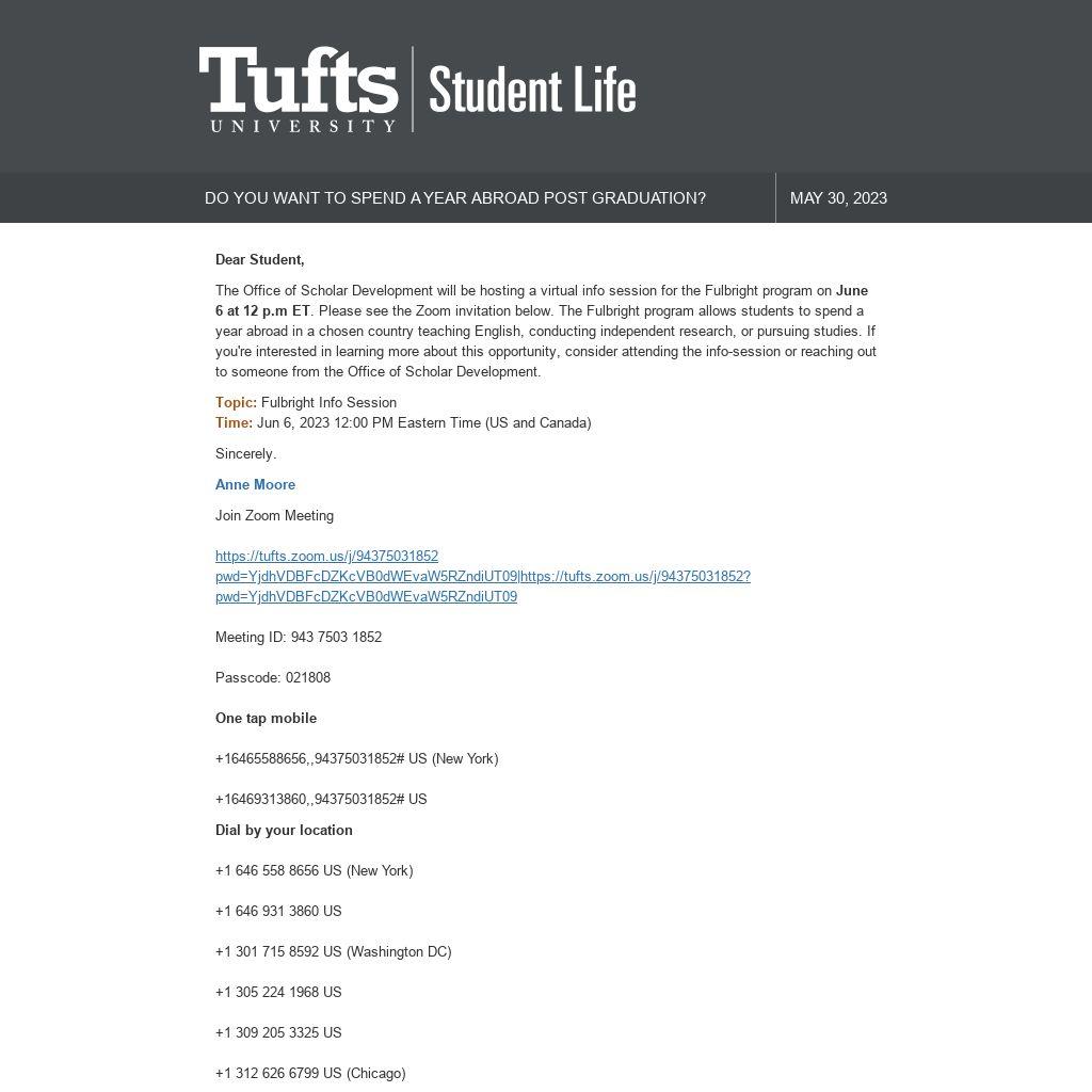 The Office of Scholar Development will be hosting a virtual info session for the Fulbright program on June 6 at 12 p.m ET. Please see the Zoom invitation below. The Fulbright program allows students to spend a year abroad in a chosen country teaching English, conducting independent research, or pursuing studies. If you're interested in learning more about this opportunity, consider attending the info-session or reaching out to someone from the Office of Scholar Development.