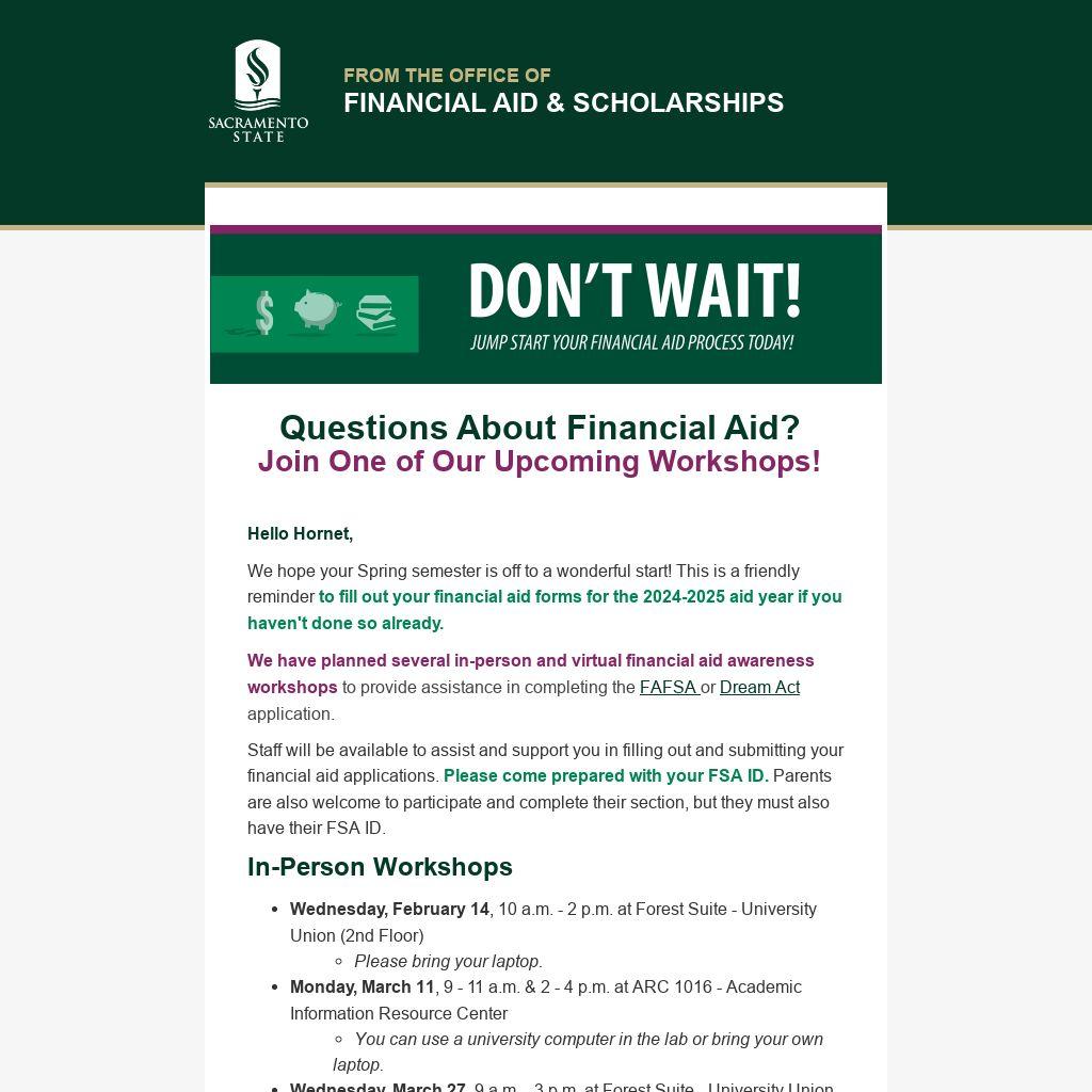 We hope your Spring semester is off to a wonderful start! This is a friendly reminder to fill out your financial aid forms for the 2024-2025 aid year if you haven't done so already.