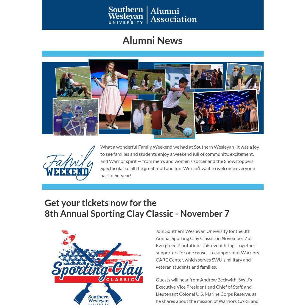 The Southern Wesleyan University (SWU) Alumni Board is actively engaging in campus life and invites YOU - our alumni, friends, and community to join in upcoming events. From the November Sporting Clay fundraiser, the Military Appreciation gathering, and cherished Christmas celebrations at SWU, the Alumni Board is committed to creating meaningful opportunities for connection.Â