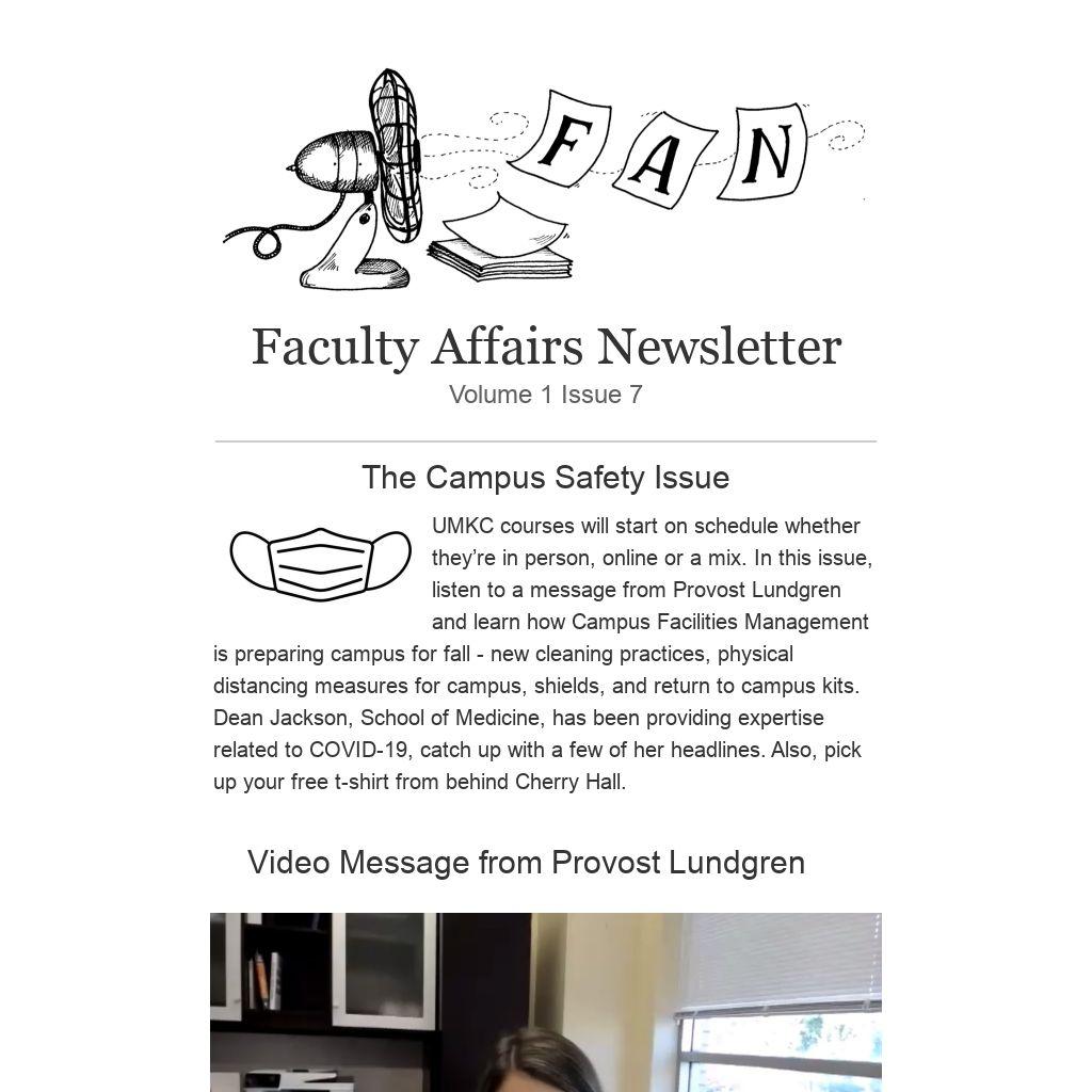 UMKC courses will start on schedule whether they’re in person, online or a mix. In this issue, listen to a message from Provost Lundgren and learn how Campus Facilities Management is preparing campus for fall - new cleaning practices, physical distancing measures for campus, shields, and return to campus kits. Dean Jackson, School of Medicine, has been providing expertise related to COVID-19, catch up with a few of her headlines. Also, pick up your free t-shirt from behind Cherry Hall.