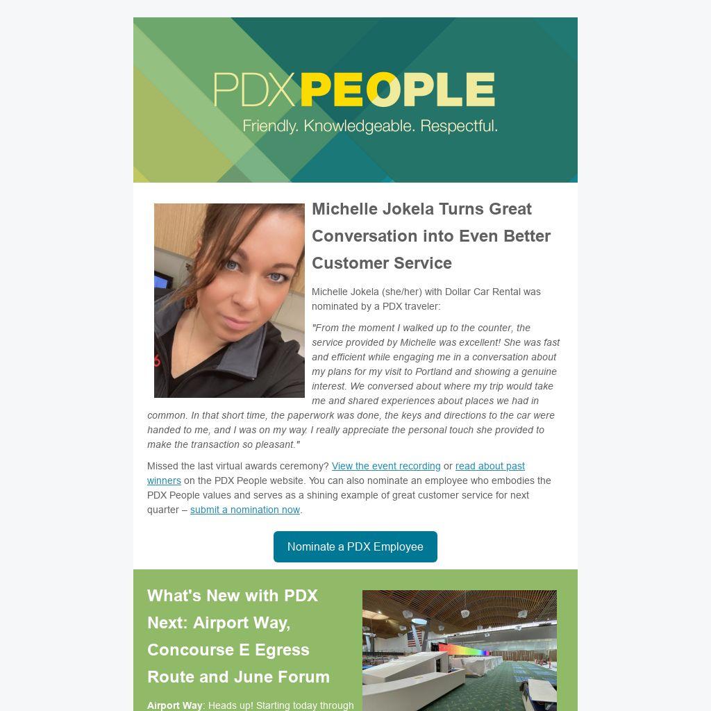 June Forum: Mark your calendars for Tuesday, June 25, at 10:30 a.m. to get the inside scoop on construction at PDX. Jen Reynolds from the Port of Portland along with Pat Bifone and Bri Leiblie of Hoffman-Skanska share the latest construction updates and answer your questions about PDX Next in just 30 minutes. If you'd like to join the meeting, email PDX People Communications before Monday, June 24, for the meeting link.