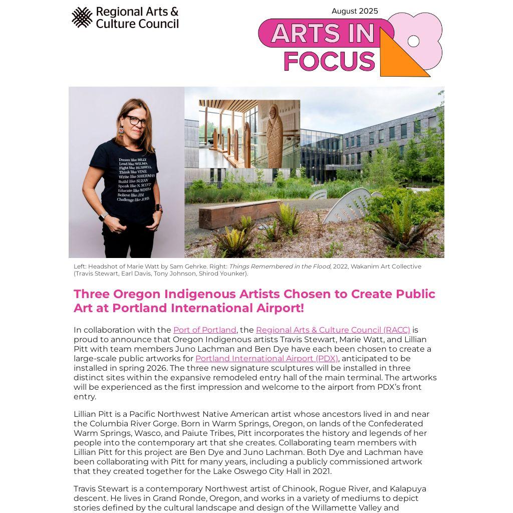 In collaboration with the Port of Portland, the Regional Arts & Culture Council (RACC) is proud to announce that Oregon Indigenous artists Travis Stewart, Marie Watt, and Lillian Pitt with team members Juno Lachman and Ben Dye have each been chosen to create a large-scale public artworks for Portland International Airport (PDX), anticipated to be installed in spring 2026. The three new signature sculptures will be installed in three distinct sites within the expansive remodeled entry hall of the main terminal. The artworks will be experienced as the first impression and welcome to the airport from PDX’s front entry.