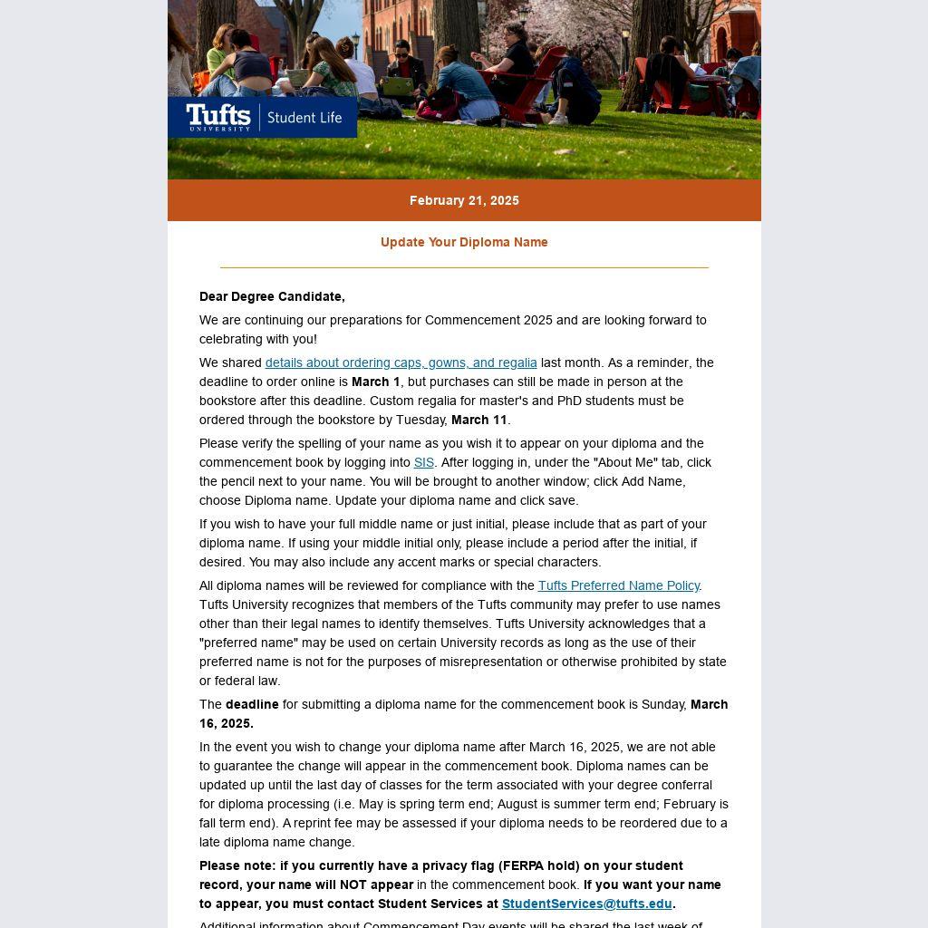 Please note: if you currently have a privacy flag (FERPA hold) on your student record, your name will NOT appear in the commencement book. If you want your name to appear, you must contact Student Services at StudentServices@tufts.edu.