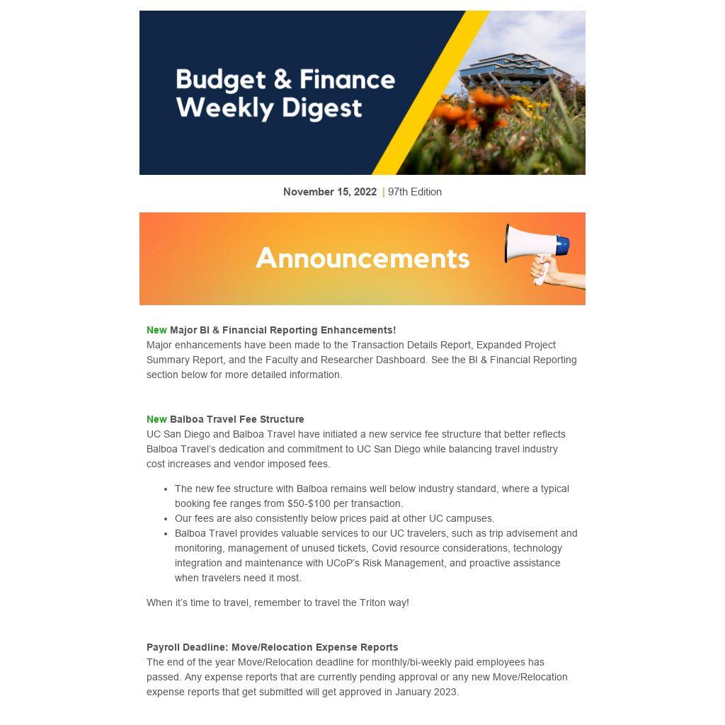Each Tuesday, the Weekly Digest provides important updates related to Budget & Finance, including Oracle Financials Cloud and Concur Travel & Expense.