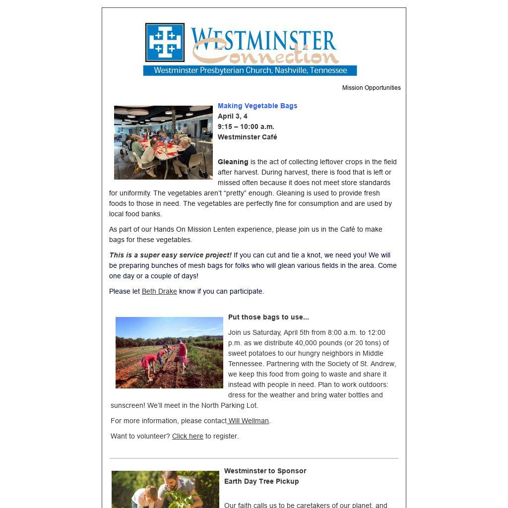 As part of our Hands On Mission Lenten experience, please join us in the Café to make bags for these vegetables.