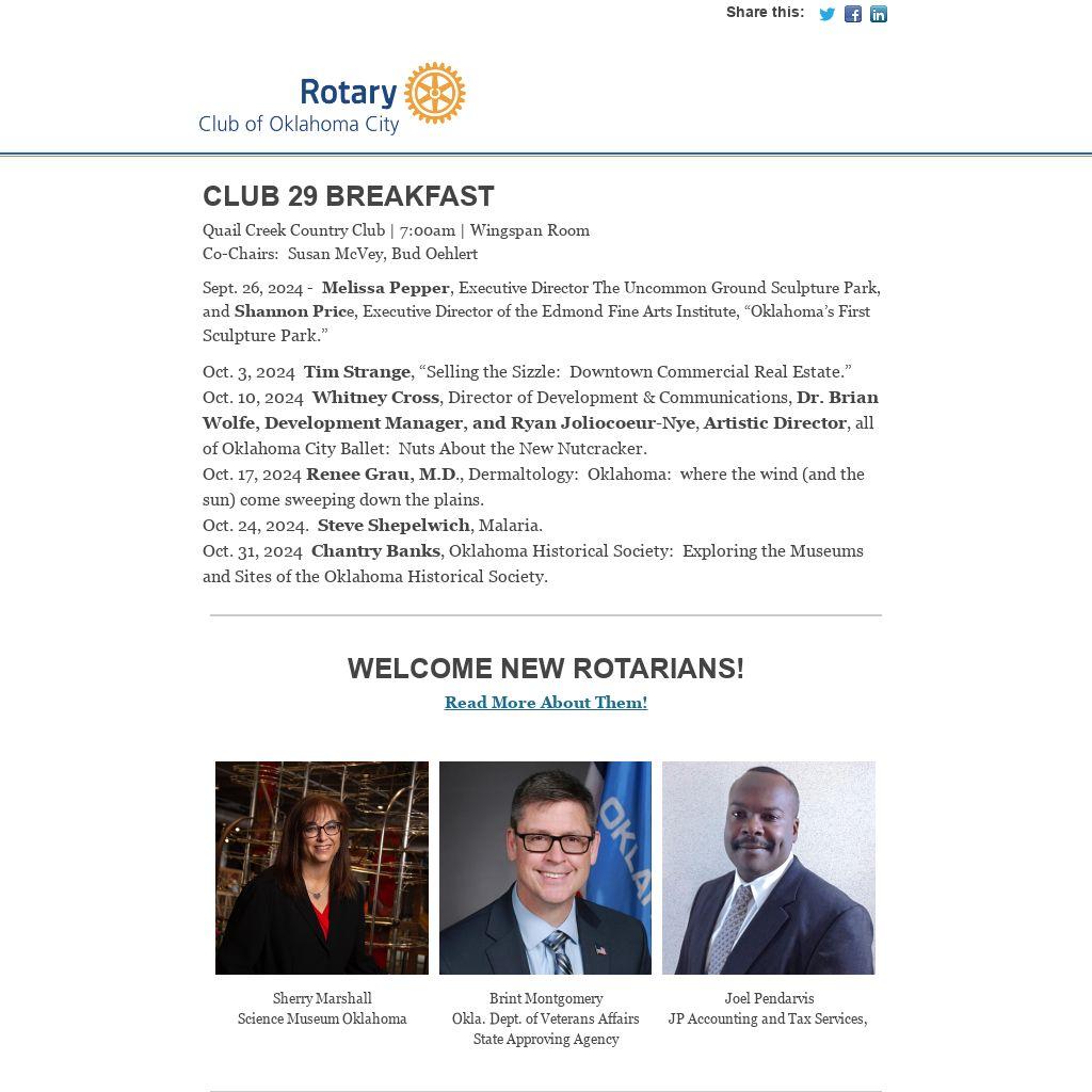October 1, 2024 - Rotary AfterHours - RSVP December 6, 2024 - Salvation Army Bell Ringing January 7, 2025 - Winter Party January 25, 2025 - Pickleball Tournament - Chicken 'n Pickle 10-1 April 23, 2025 - Rotary Club of Okla. City visits Rotary Club of Tulsa