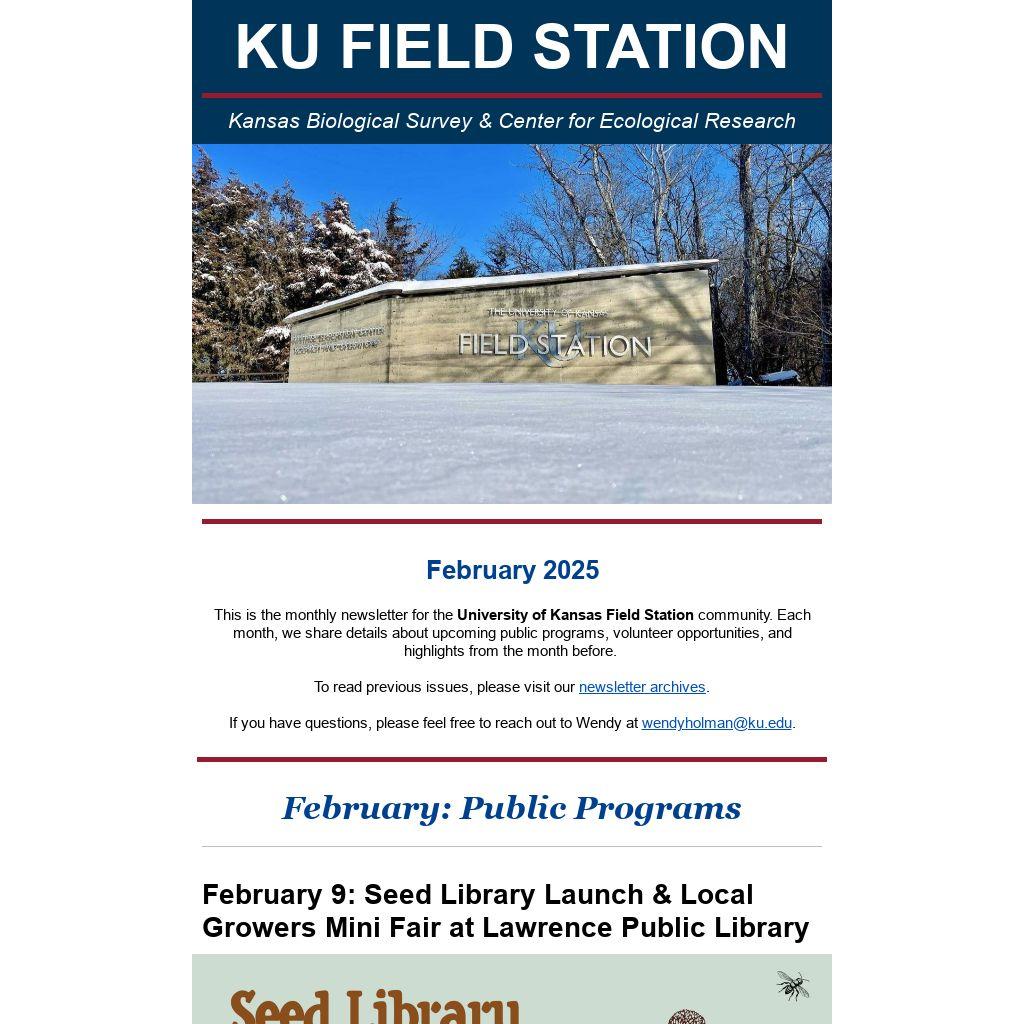 This is the monthly newsletter for the University of Kansas Field Station community. Each month, we share details about upcoming public programs, volunteer opportunities, and highlights from the month before.