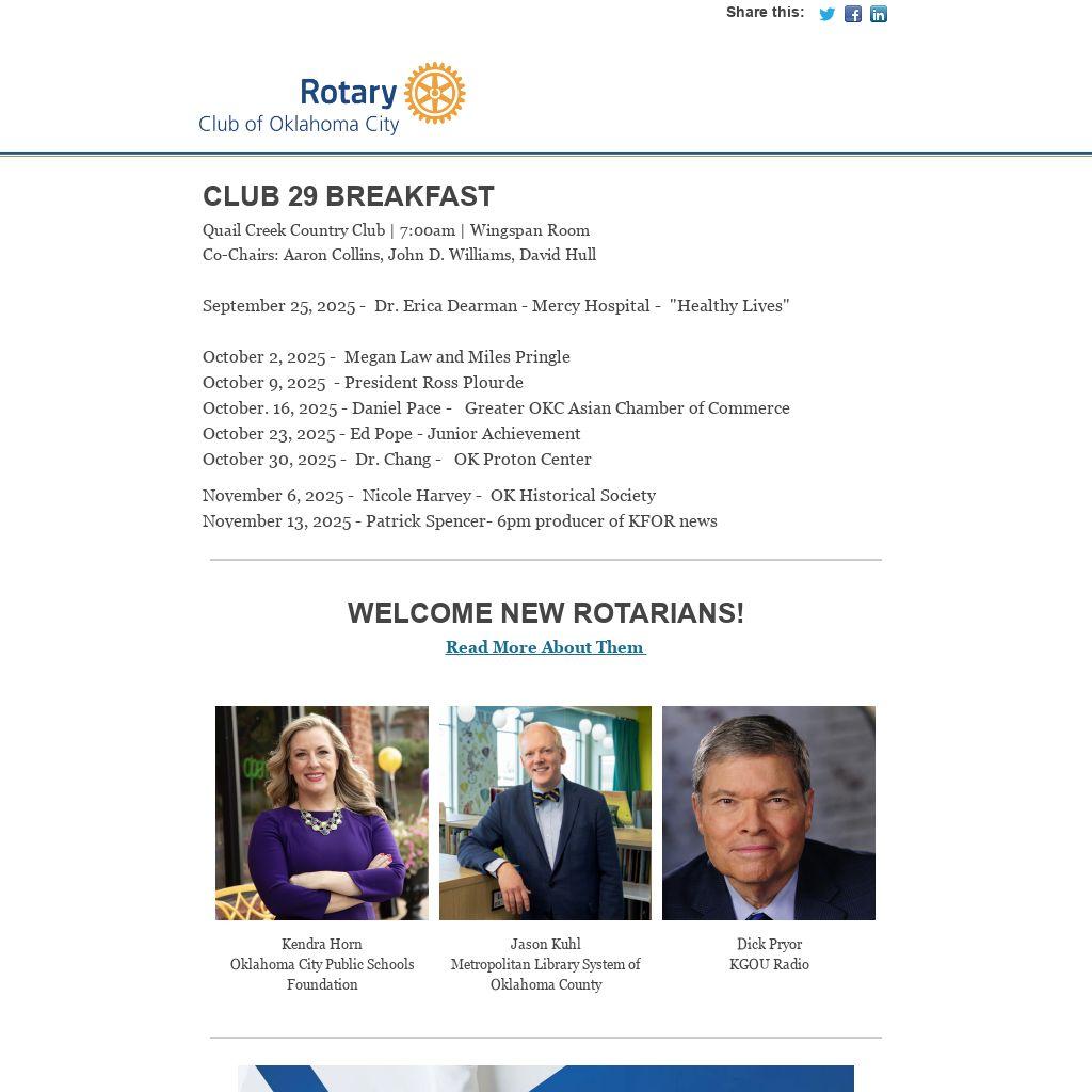 2025-26 Program Schedule September 30, 2025 - Mike Dillard – Century Martial Arts October 7, 2025 - OnePledge Annoucement