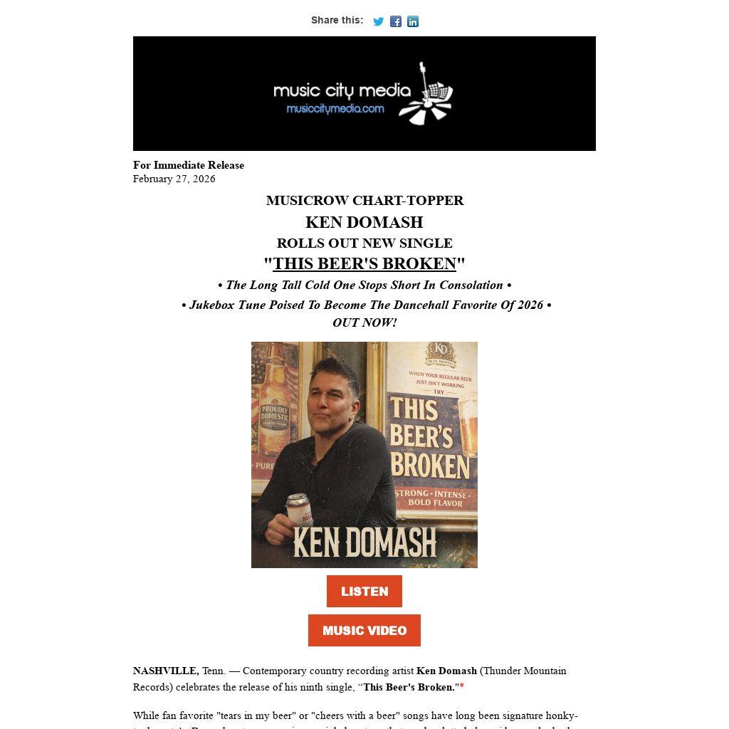 NASHVILLE, Tenn. — Contemporary country recording artist Ken Domash (Thunder Mountain Records) celebrates the release of his ninth single, “This Beer's Broken."*