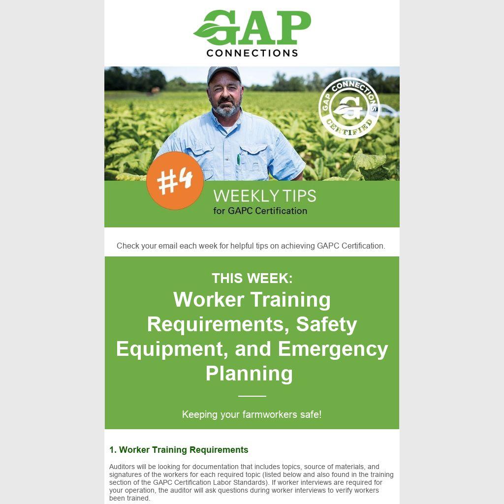 Auditors will be looking for documentation that includes topics, source of materials, and signatures of the workers for each required topic (listed below and also found in the training section of the GAPC Certification Labor Standards). If worker interviews are required for your operation, the auditor will ask questions during worker interviews to verify workers been trained.