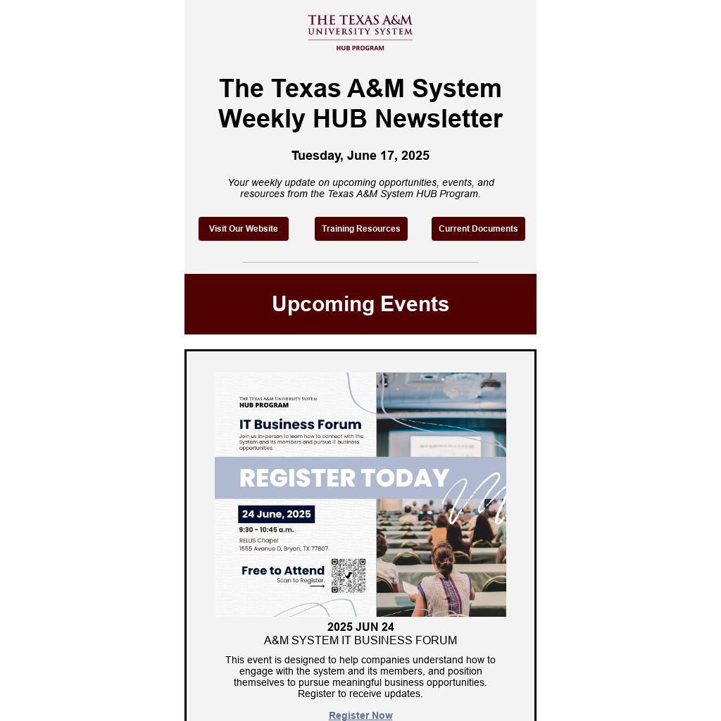 Your weekly update on upcoming opportunities, events, and resources from the Texas A&M System HUB Program.