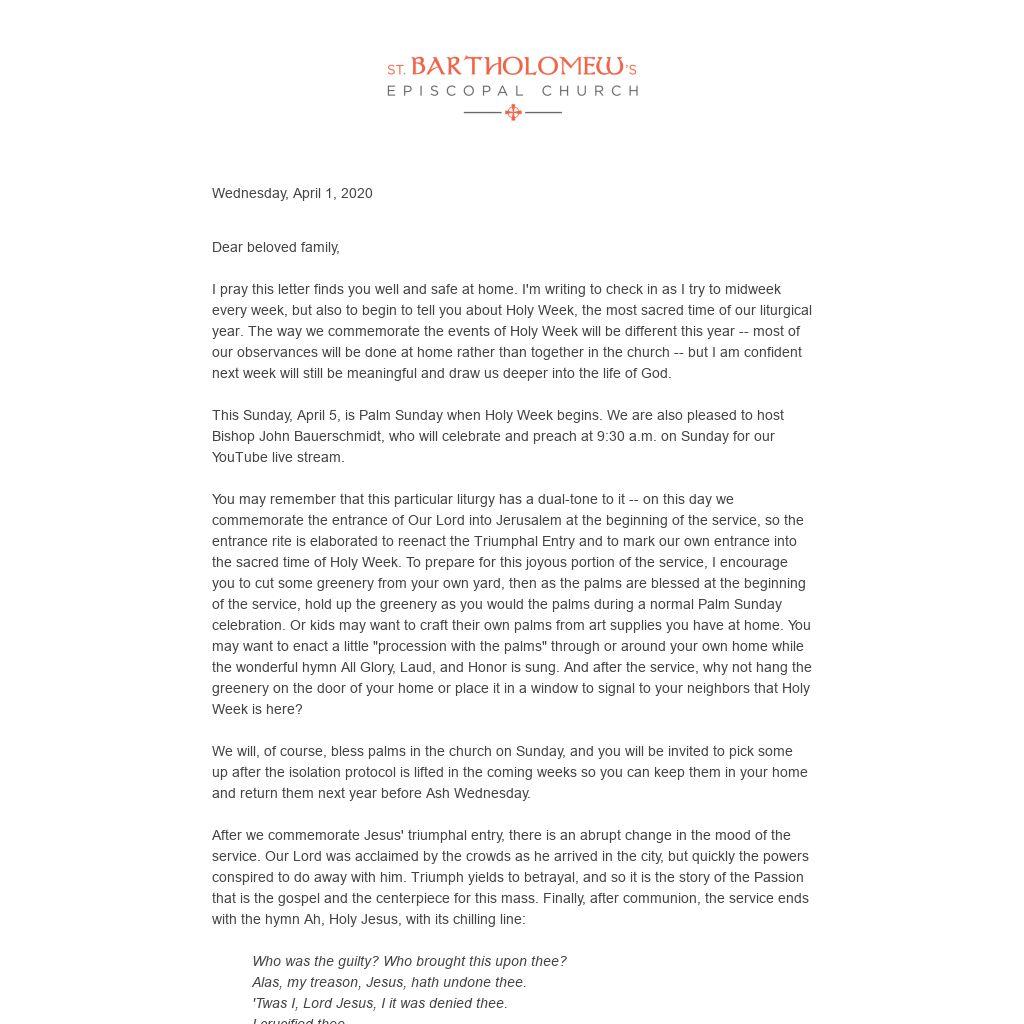 I pray this letter finds you well and safe at home. I'm writing to check in as I try to midweek every week, but also to begin to tell you about Holy Week, the most sacred time of our liturgical year. The way we commemorate the events of Holy Week will be different this year -- most of our observances will be done at home rather than together in the church -- but I am confident next week will still be meaningful and draw us deeper into the life of God.