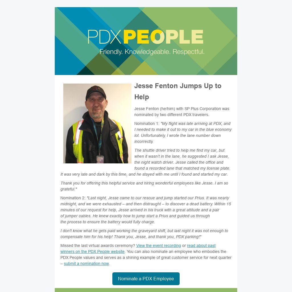 Jesse Fenton (he/him) with SP Plus Corporation was nominated by two different PDX travelers.