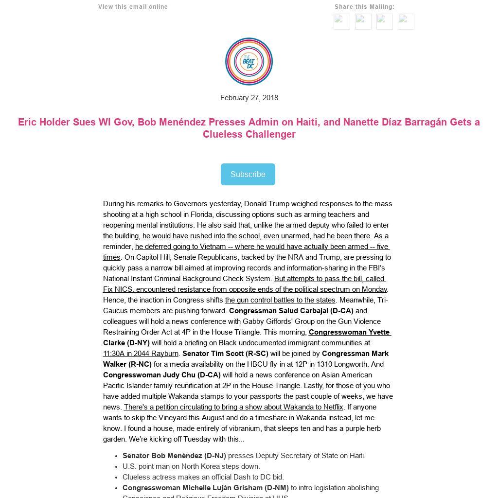 During his remarks to Governors yesterday, Donald Trump weighed responses to the mass shooting at a high school in Florida, discussing options such as arming teachers and reopening mental institutions. He also said that, unlike the armed deputy who failed to enter the building, he would have rushed into the school, even unarmed, had he been there. As a reminder, he deferred going to Vietnam -- where he would have actually been armed -- five times. On Capitol Hill, Senate Republicans, backed by the NRA and Trump, are pressing to quickly pass a narrow bill aimed at improving records and information-sharing in the FBI’s National Instant Criminal Background Check System. But attempts to pass the bill, called Fix NICS, encountered resistance from opposite ends of the political spectrum on Monday. Hence, the inaction in Congress shifts the gun control battles to the states. Meanwhile, Tri-Caucus members are pushing forward. Congressman Salud Carbajal (D-CA) and colleagues will hold a news conference with Gabby Giffords' Group on the Gun Violence Restraining Order Act at 4P in the House Triangle. This morning, Congresswoman Yvette Clarke (D-NY) will hold a briefing on Black undocumented immigrant communities at 11:30A in 2044 Rayburn. Senator Tim Scott (R-SC) will be joined by Congressman Mark Walker (R-NC) for a media availability on the HBCU fly-in at 12P in 1310 Longworth. And Congresswoman Judy Chu (D-CA) will hold a news conference on Asian American Pacific Islander family reunification at 2P in the House Triangle. Lastly, for those of you who have added multiple Wakanda stamps to your passports the past couple of weeks, we have news. There's a petition circulating to bring a show about Wakanda to Netflix. If anyone wants to skip the Vineyard this August and do a timeshare in Wakanda instead, let me know. I found a house, made entirely of vibranium, that sleeps ten and has a purple herb garden. We’re kicking off Tuesday with this...