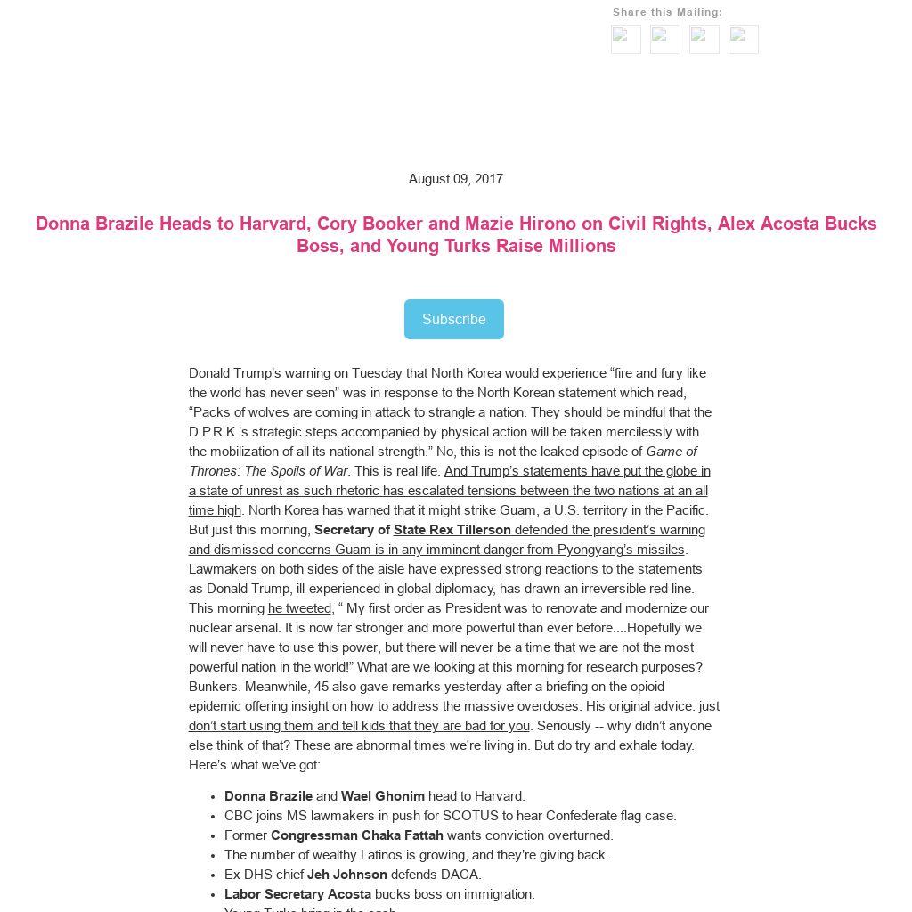 Donald Trump’s warning on Tuesday that North Korea would experience “fire and fury like the world has never seen” was in response to the North Korean statement which read, “Packs of wolves are coming in attack to strangle a nation. They should be mindful that the D.P.R.K.’s strategic steps accompanied by physical action will be taken mercilessly with the mobilization of all its national strength.” No, this is not the leaked episode of Game of Thrones: The Spoils of War. This is real life. And Trump’s statements have put the globe in a state of unrest as such rhetoric has escalated tensions between the two nations at an all time high. North Korea has warned that it might strike Guam, a U.S. territory in the Pacific. But just this morning, Secretary of State Rex Tillerson defended the president’s warning and dismissed concerns Guam is in any imminent danger from Pyongyang’s missiles. Lawmakers on both sides of the aisle have expressed strong reactions to the statements as Donald Trump, ill-experienced in global diplomacy, has drawn an irreversible red line. This morning he tweeted, “ My first order as President was to renovate and modernize our nuclear arsenal. It is now far stronger and more powerful than ever before....Hopefully we will never have to use this power, but there will never be a time that we are not the most powerful nation in the world!” What are we looking at this morning for research purposes? Bunkers. Meanwhile, 45 also gave remarks yesterday after a briefing on the opioid epidemic offering insight on how to address the massive overdoses. His original advice: just don’t start using them and tell kids that they are bad for you. Seriously -- why didn’t anyone else think of that? These are abnormal times we're living in. But do try and exhale today. Here’s what we’ve got:- Donna Brazile and Wael Ghonim head to Harvard.