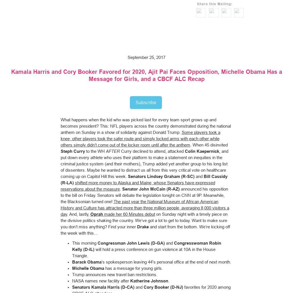 - Senators Kamala Harris (D-CA) and Cory Booker (D-NJ) favorites for 2020 among CBCF ALC attendees.