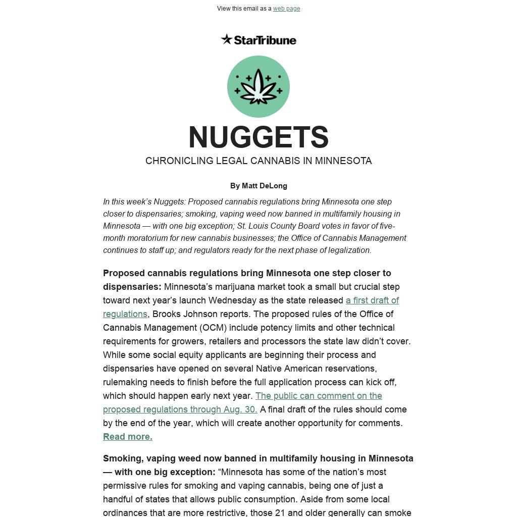 Proposed cannabis regulations bring Minnesota one step closer to dispensaries: Minnesota’s marijuana market took a small but crucial step toward next year’s launch Wednesday as the state released a first draft of regulations, Brooks Johnson reports. The proposed rules of the Office of Cannabis Management (OCM) include potency limits and other technical requirements for growers, retailers and processors the state law didn’t cover. While some social equity applicants are beginning their process and dispensaries have opened on several Native American reservations, rulemaking needs to finish before the full application process can kick off, which should happen early next year. The public can comment on the proposed regulations through Aug. 30. A final draft of the rules should come by the end of the year, which will create another opportunity for comments. Read more.