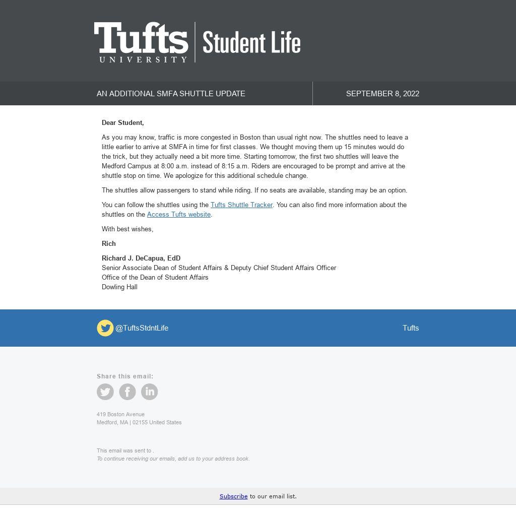 As you may know, traffic is more congested in Boston than usual right now. The shuttles need to leave a little earlier to arrive at SMFA in time for first classes. We thought moving them up 15 minutes would do the trick, but they actually need a bit more time. Starting tomorrow, the first two shuttles will leave the Medford Campus at 8:00 a.m. instead of 8:15 a.m. Riders are encouraged to be prompt and arrive at the shuttle stop on time. We apologize for this additional schedule change.