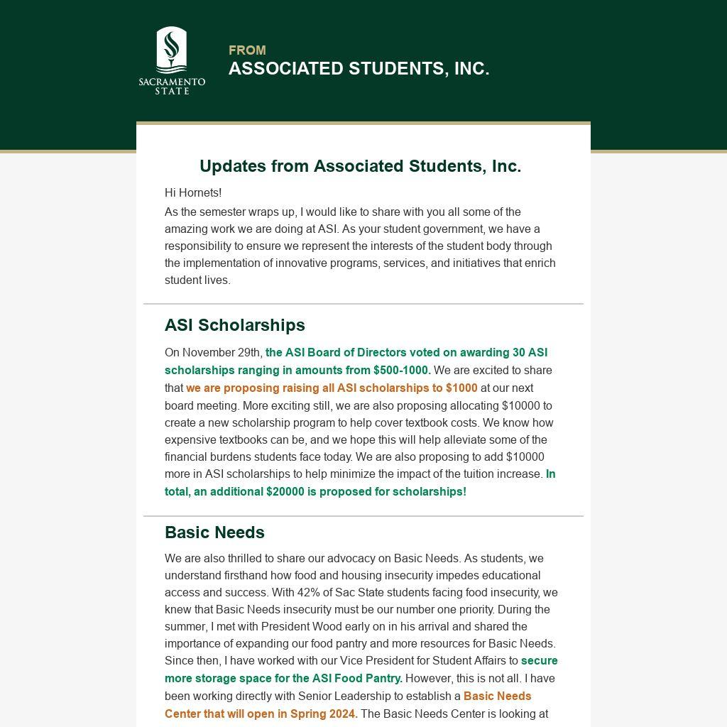 We are also thrilled to share our advocacy on Basic Needs. As students, we understand firsthand how food and housing insecurity impedes educational access and success. With 42% of Sac State students facing food insecurity, we knew that Basic Needs insecurity must be our number one priority. During the summer, I met with President Wood early on in his arrival and shared the importance of expanding our food pantry and more resources for Basic Needs. Since then, I have worked with our Vice President for Student Affairs to secure more storage space for the ASI Food Pantry. However, this is not all. I have been working directly with Senior Leadership to establish a Basic Needs Center that will open in Spring 2024. The Basic Needs Center is looking at having a second satellite food pantry to be able to serve more students and establish a clothing closet that would collect donations and create a closet for students to have access to free clothing.