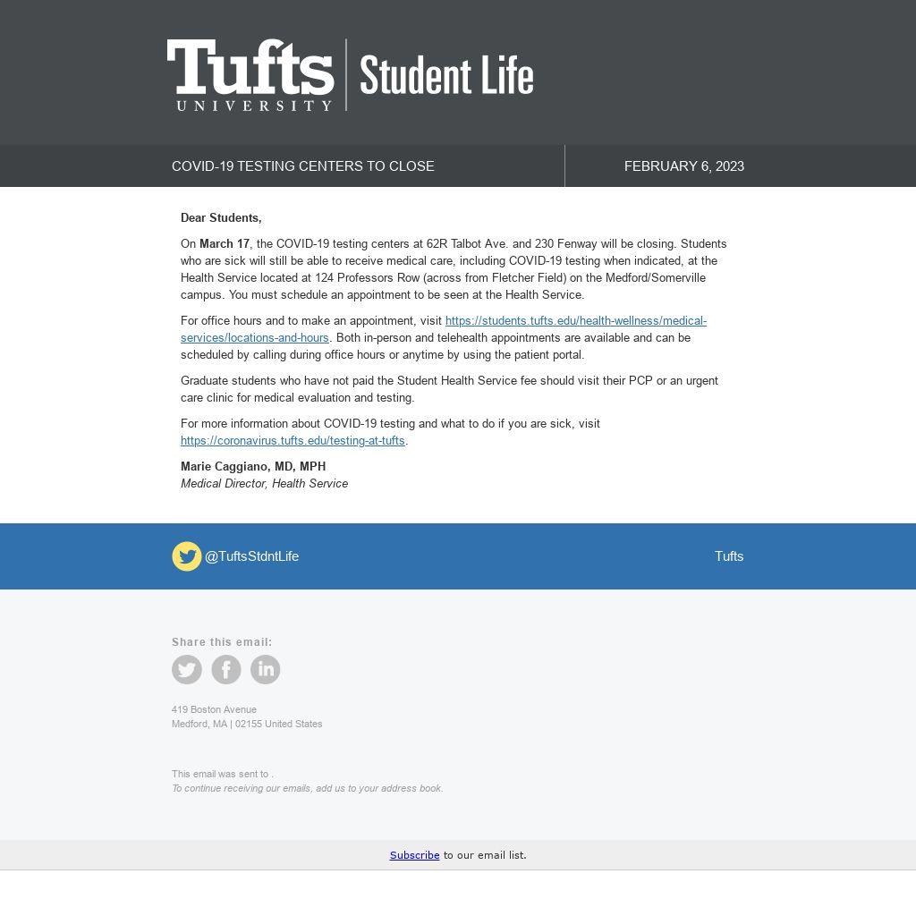 On March 17, the COVID-19 testing centers at 62R Talbot Ave. and 230 Fenway will be closing. Students who are sick will still be able to receive medical care, including COVID-19 testing when indicated, at the Health Service located at 124 Professors Row (across from Fletcher Field) on the Medford/Somerville campus. You must schedule an appointment to be seen at the Health Service.